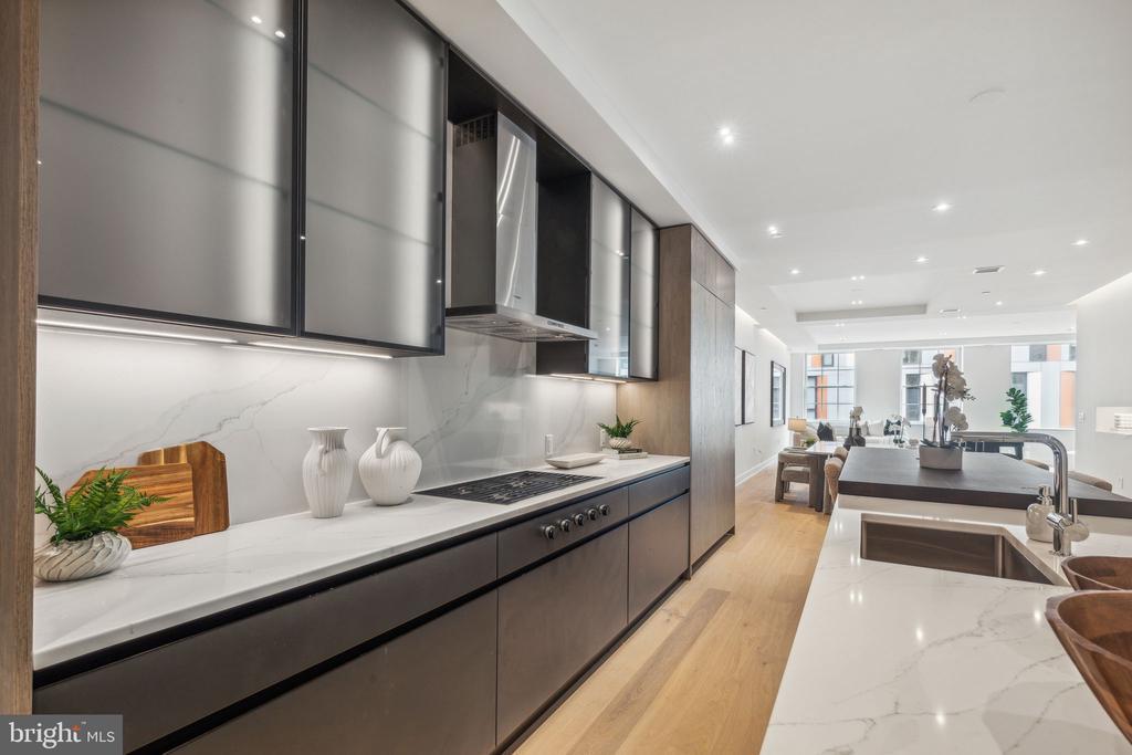 At the center of the residence is an Italian-imported Scavolini kitchen, a sculptural showpiece with minimalist cabinetry and bookmatched Compac Unique Calacatta countertops. Designed for both beauty and performance, the kitchen is outfitted with a suite of professional-grade appliances, including a 36” Wolf gas range, Sub-Zero refrigerator, Wolf microwave, ASKO dishwasher, and wine fridge. The oversized island anchors the expansive open living and dining areas, creating an ideal setting for both intimate evenings and stylish entertaining.